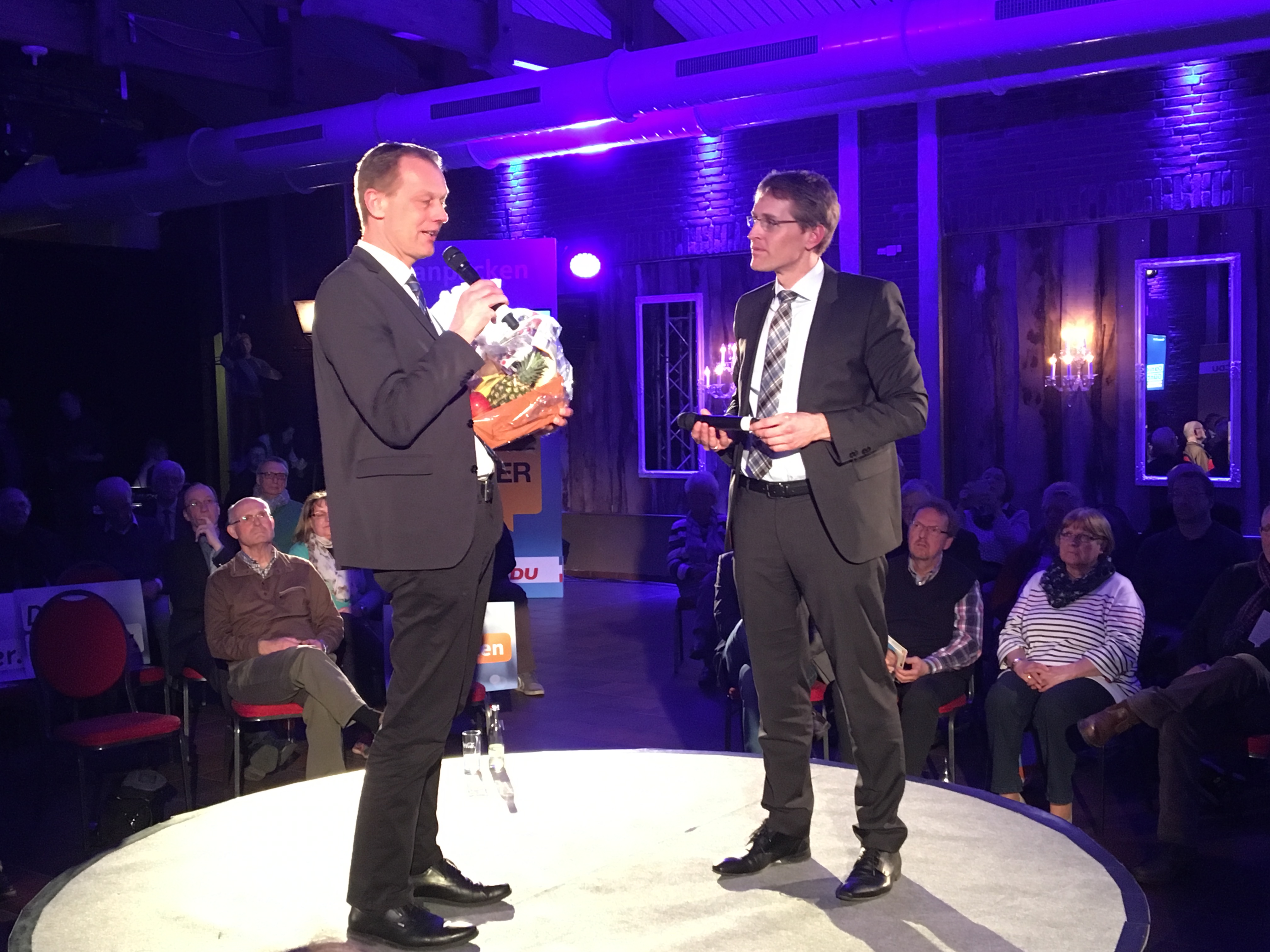 Über 150 Gäste waren gekommen, um den Spitzenkandidaten live zu erleben. Und der legte gleich los, auf der neuen runden Bühne mitten im Publikum und attackierte geistreich die Landesregierung. Er wundere sich, dass Ministerpräsident Albig sich so selten den direkten Rededuellen mit ihm stelle und er sich stattdessen immer mit dem SPD-Spitzenkandidat Stegner auseinander setzen müsse, der nach dem Ausgang der Landtagswahlen im Saarland noch üblere Laune hatte. „Die Frage lautet also: wird die nächste Landesregierung von Daniel Günther oder von Ralf Stegner geführt?!“