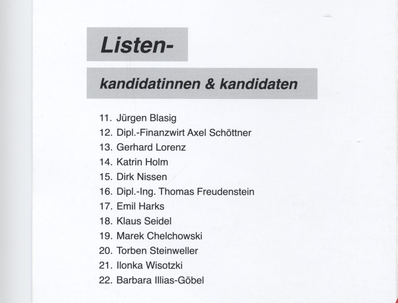 Listenkandidatinnen und –kandidaten: 1. Jürgen Blasig; 2. Dipl.-Finanzwirt Axel Schöttner; 3. Gerhard Lorenz; 4. Katrin Holm; 5. Dirk Nissen; 6. Dipl.-Ing. Thomas Freudenstein; 7. Emil Harks; 8. Klaus Seidel; 9. Marek Chelchowski; 10. Torben Steinweller; 11. Ilonka Wisotzki; 12. Barbara Illias-Göbel