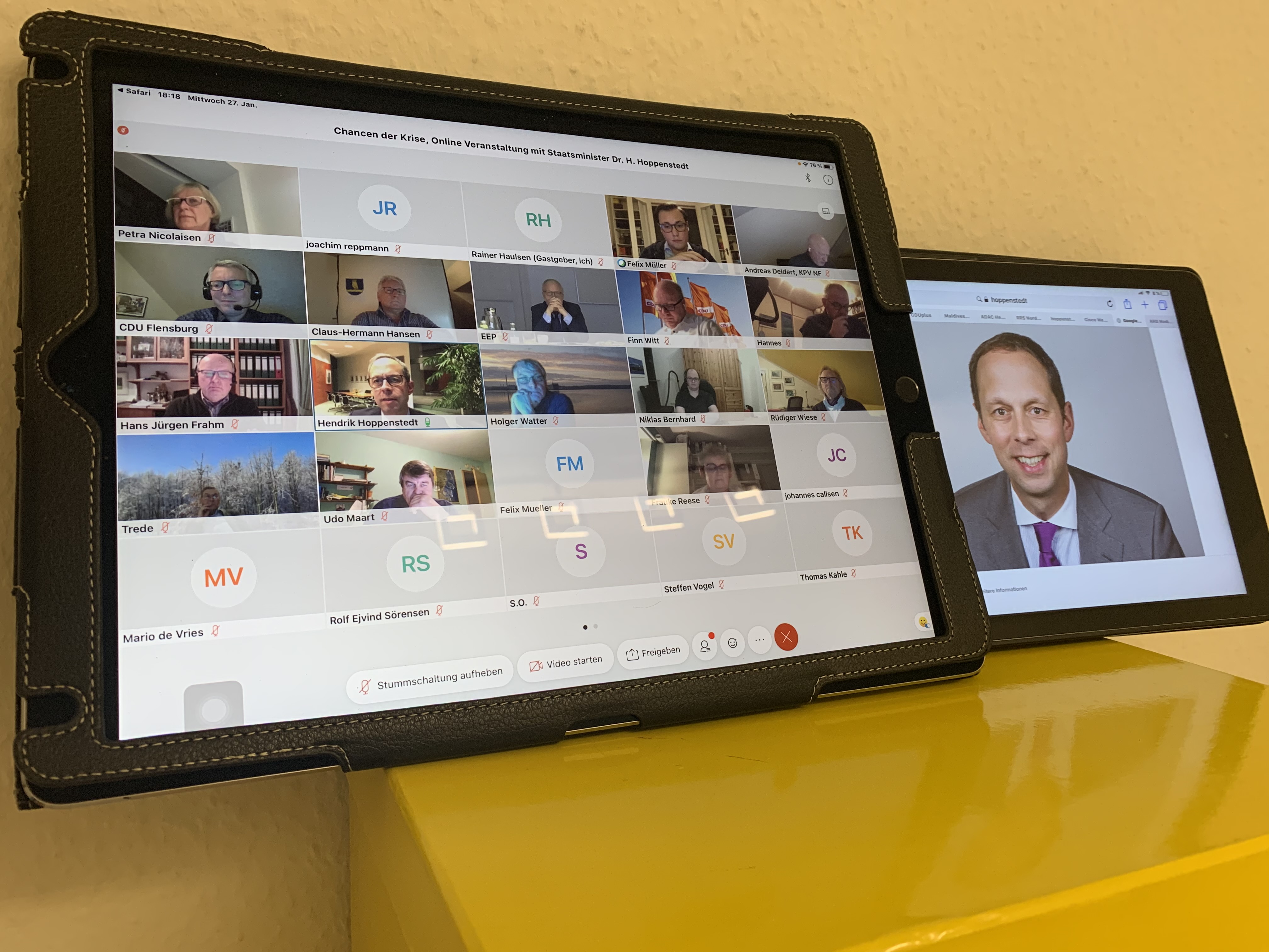Der Lockdown, die Folgen und ein möglicher Stufenplan zur Rückkehr zur Normalität, das waren die Themen anlässlich der digitalen Veranstaltung „Chancen der Krise“, zu der die CDU-Kreisverbände Schleswig-Flensburg und Flensburg eingeladen hatten. Als Gastreferenten hatte Petra Nicolaisen den Staatsminister bei der Bundeskanzlerin und Bundestagskollegen, Dr. Hendrik Hoppenstedt, eingeladen, der sich direkt aus dem Bundeskanzleramt zugeschaltet hatte.