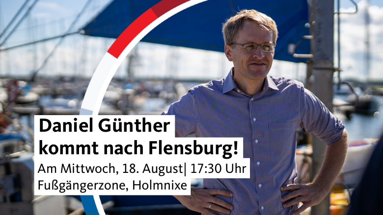 Wahlkampfunterstützung erhält Petra Nicolaisen am 18. August von unserem Landesvorsitzenden Daniel Günther. Ab 17.30 Uhr findet heirzu ein Bürgertreff in der Fußgängerzone in Flensburg, Höhe Holmnixe für rd. eine Stunde statt. Alle Bürgerinnen und Bürger sind heirzu erhzlich eingeladen. Wir freuen uns auf Sie!