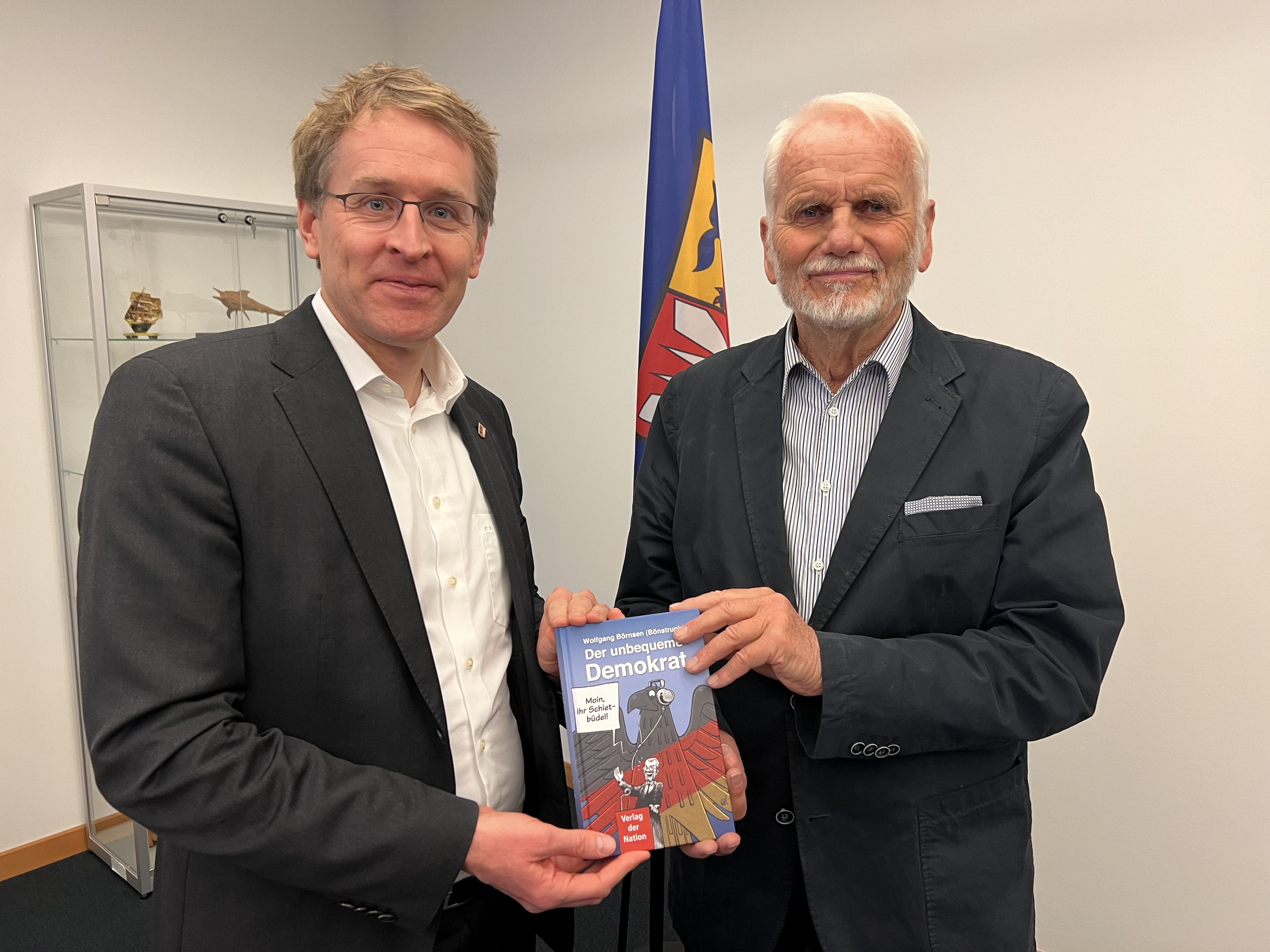 Passend zum Weihnachtsfest überreichte jetzt der ehemaligen Flensburger MdB Wolfgang Börnsen Ministerpräsident Daniel Günther, MdL, seinen neuen Band über den Parlamentarismus. Er trägt den Titel „Der unbequeme Demokrat“.