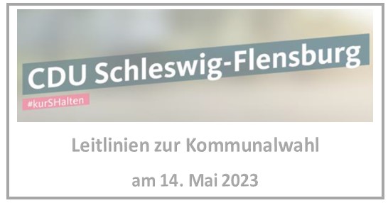 Leitlinien der CDU-Schleswig-Flensburg zur Kommunalwahl 2023 Hier finden Sie die Leitlinien zur Kommunalwahl 2023 (Wahlprogramm) DateiDownload (619 KB) Empfehlen Sie uns!Bei Facebook teilen Bei Twitter (X) teilen Bei Whatsapp teilen Diese Seite drucken Diese Seite einem Freund schicken