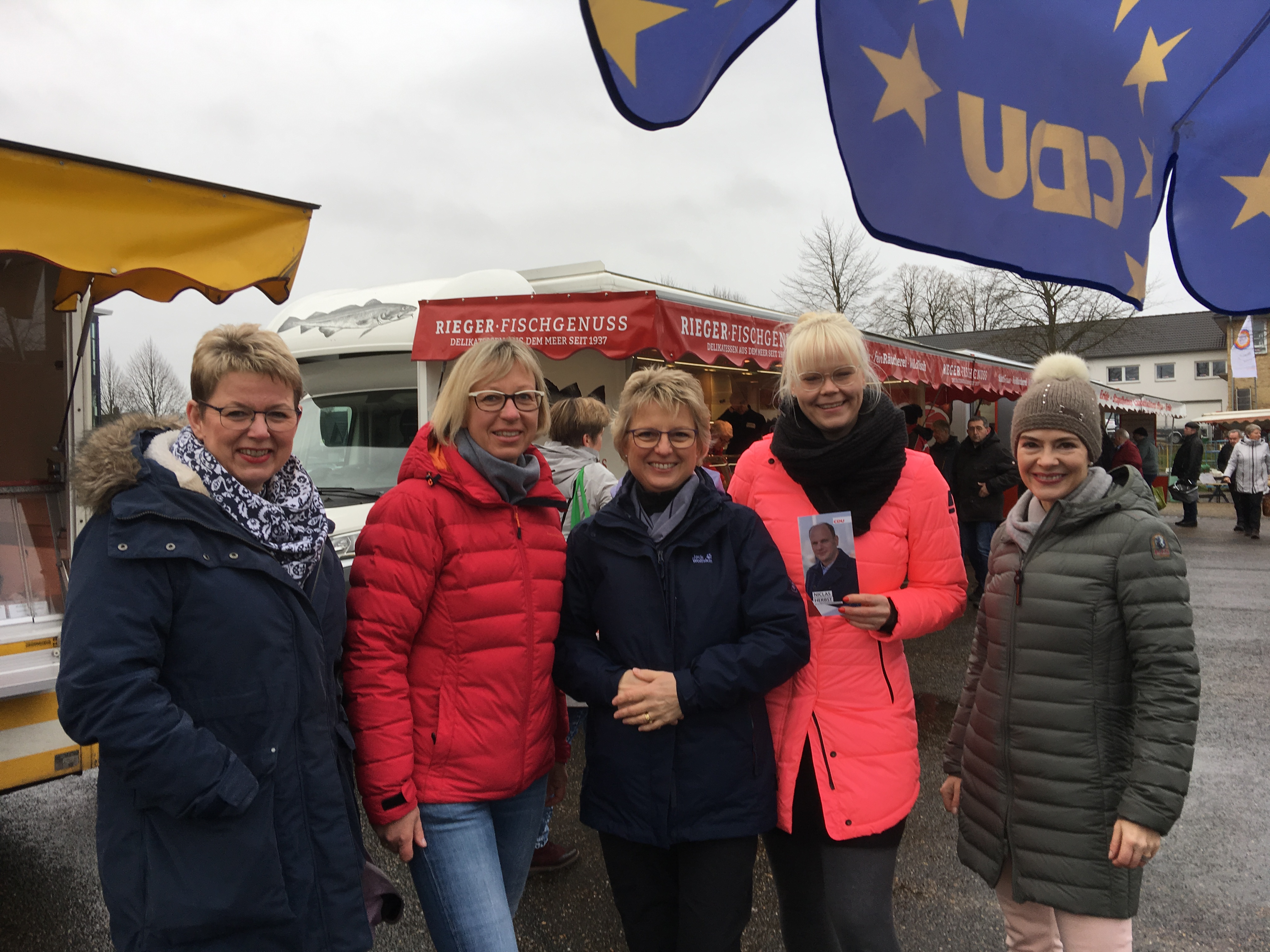 Noch bevor der Europawahlkampf richtig startet, haben Petra Nicolaisen, Stephanie Hildebrandt, Susi Ross und Annegret Sager auf dem Schleswiger Wochenmarkt Flagge für Europa gezeigt – bei einem „warming up“ mit heißem Kakao. Tatkräftig unterstützt wurden sie von Kerstin Schröder, der Nummer vier auf der Landesliste. Unter dem Motto „Europa richtig machen“ stand sie für spezielle Fragen zur Verfügung.