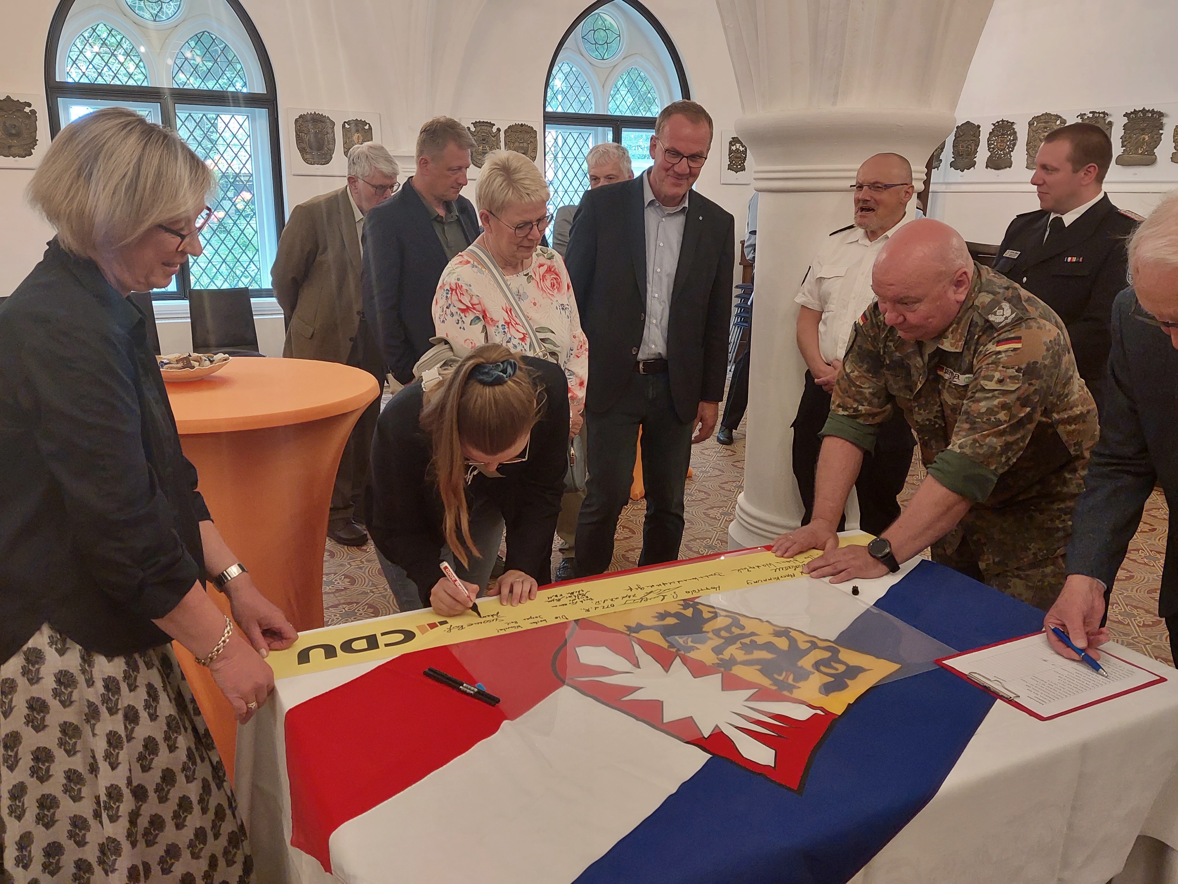Zu den Unterzeichnern, die sich bei Hausherrin Priörin Ina von Samson-Himmelstjerna im historischen Remter des Klosters eingefunden hatten, zählten die Bürgervorsteherin und der stellvertretende Bürgermeister von Schleswig, Vertreter der Bundespolizei Flensburg, der Polizei Schleswig, dem Landeskommando Kiel, der Kreisfeuerwehr, frühere Kommandeure sowie Mitglieder der Kreis-CDU.