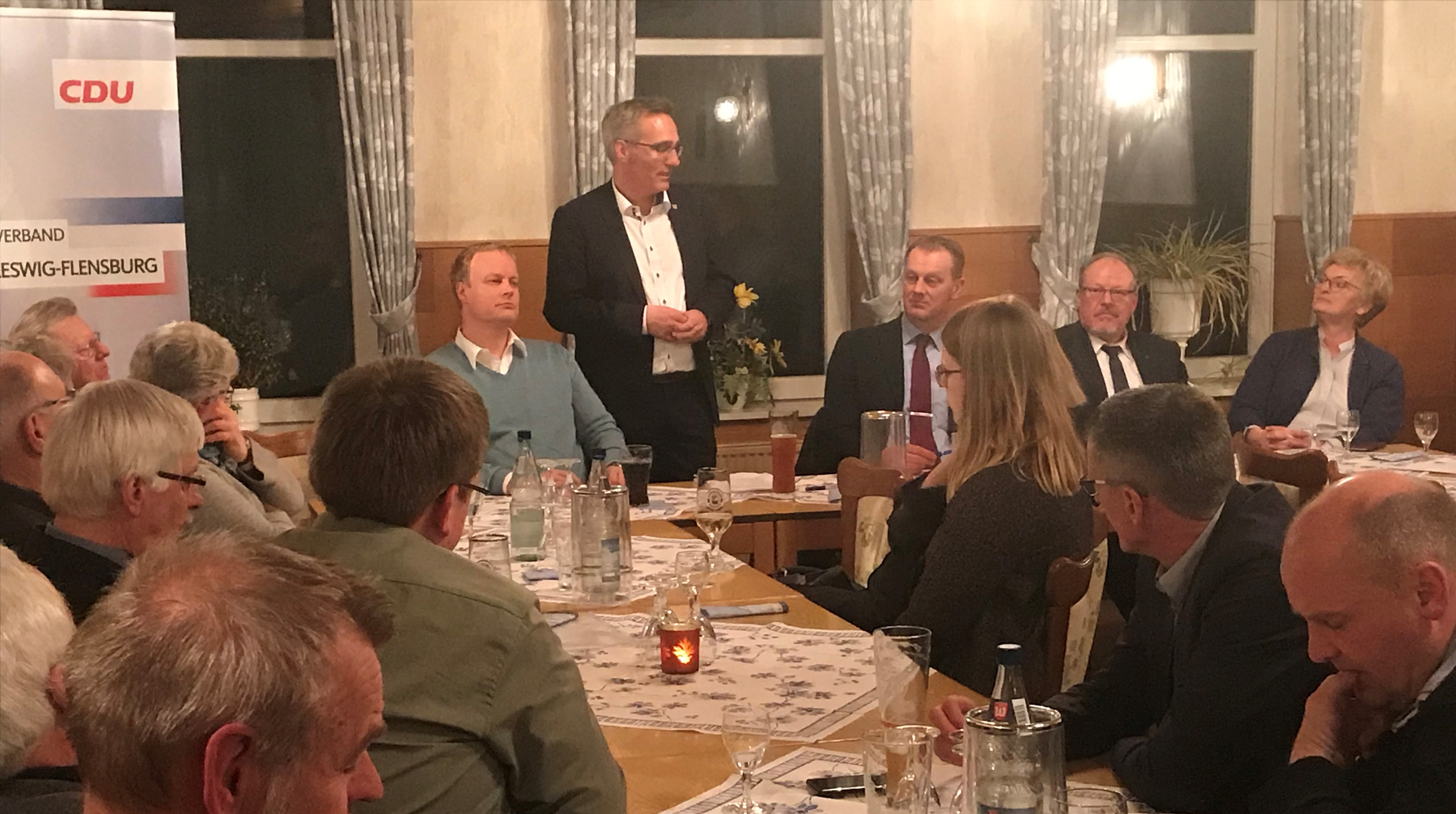 Aktuelle Fragen zur Inneren Sicherheit und zur persönlichen und sächlichen Ausstattung der Landespolizei standen im Mittelpunkt der Orstvorsitzendenkonferenz, zu der Kreisvorsitzender Johannes Callsen und Geschäftsführer Rainer Haulsen die Vorsitzenden der fast 80 Orts-, Bezirks- und Amtsverbände eingeladen hatten. In seinen Ausführungen machte der stellvertretenden Vorsitzende der CDU-Landtagsfraktion Tim Brockmann deutlich, was die von Ministerpräsident Daniel Günther geführte Landesregierung bereits nach nur 1 ½ Jahren Regierungszeit umgesetzt hat. So wurden bereits 500 zusätzliche Stellen bei der Polizei geschaffen, die Ausbildungskapazitäten in Eutin wurden deutlich erhöht. Daneben erfolgt zurzeit eine bessere persönliche Ausrüstung der Beamtinnen und Beamten was den Selbstschutz betrifft, aber auch bei der Bewaffnung oder der Versorgung mit Diensthandys macht die Landespolizei große Fortschritte. Anhand der aktuellen Kriminalstatistik konnte Brockmann berichten, dass der Kreis Schleswig-Flensburg der „zweitsicherste Kreis“ in Schleswig-Holstein sei.